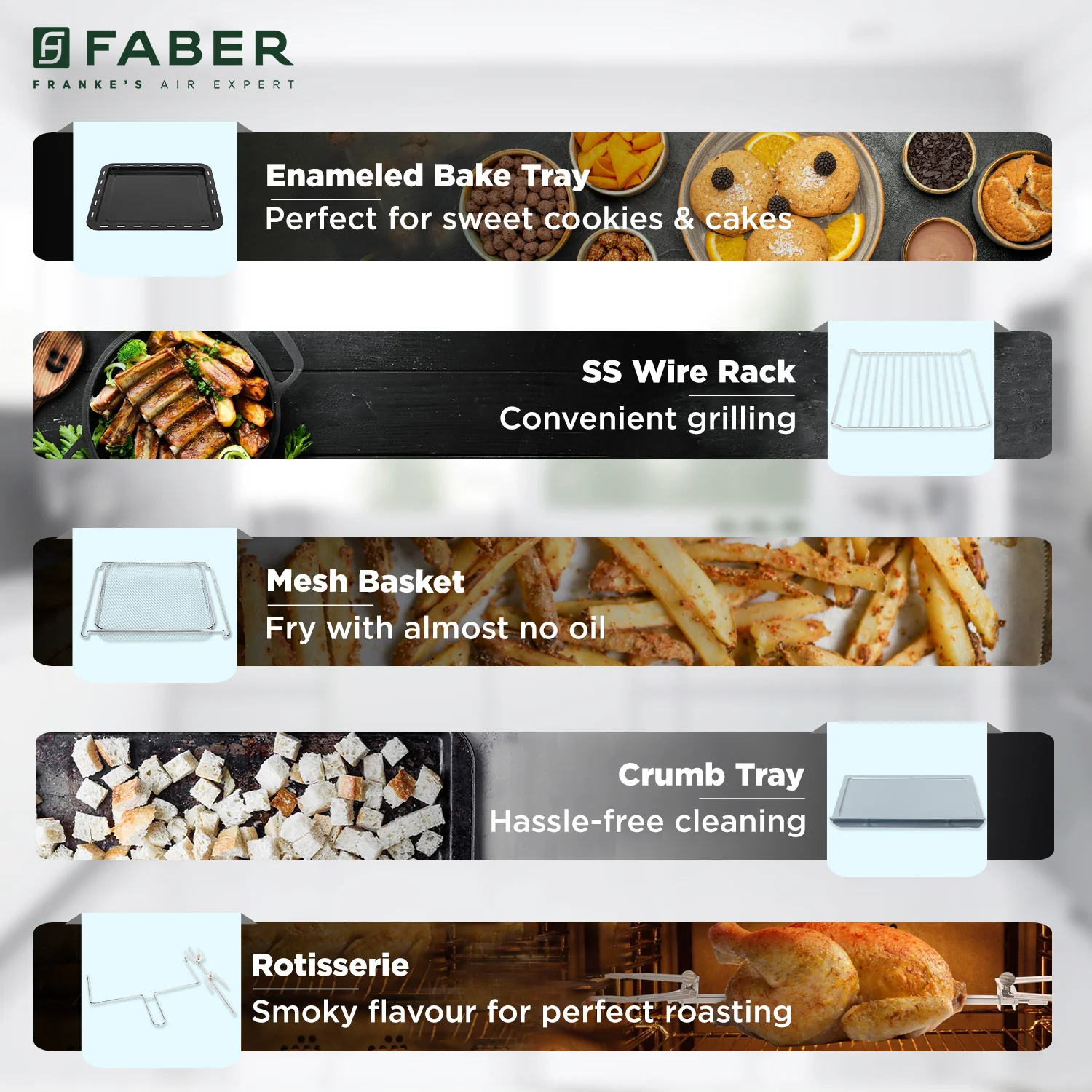Get one way solutions to your snacks craving with this air oven presented by Faber. You can prepare from crispy fries to baked delights, with just ease.